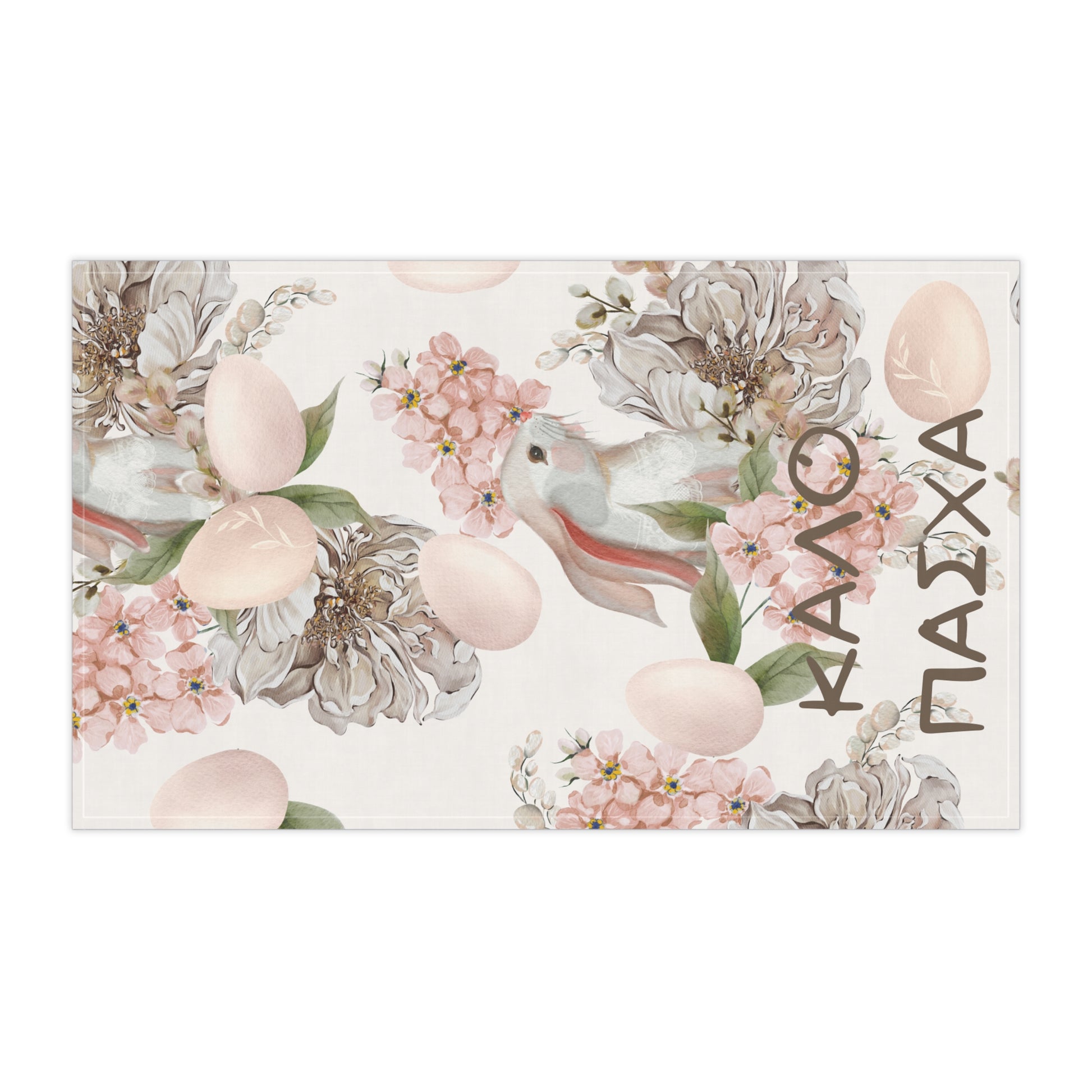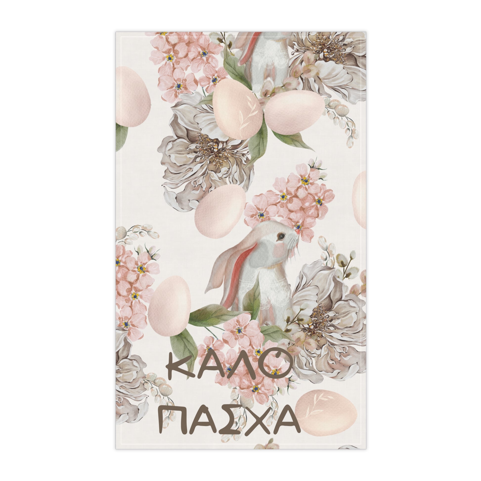 Soft, airy tea towel designed to bring a quiet, springtime pause to your kitchen. Delicate florals, pastel eggs, and a gentle bunny silhouette float across a creamy background, with the warm greeting in Greek adding a personal, homey touch. Lightweight and hemmed for durability, this towel layers effortlessly into slow breakfasts, tea rituals, and holiday table prep — slipping into daily chores while lifting the mood. It reads like a small celebration: subtle, elegant, and seasonally cheerful.